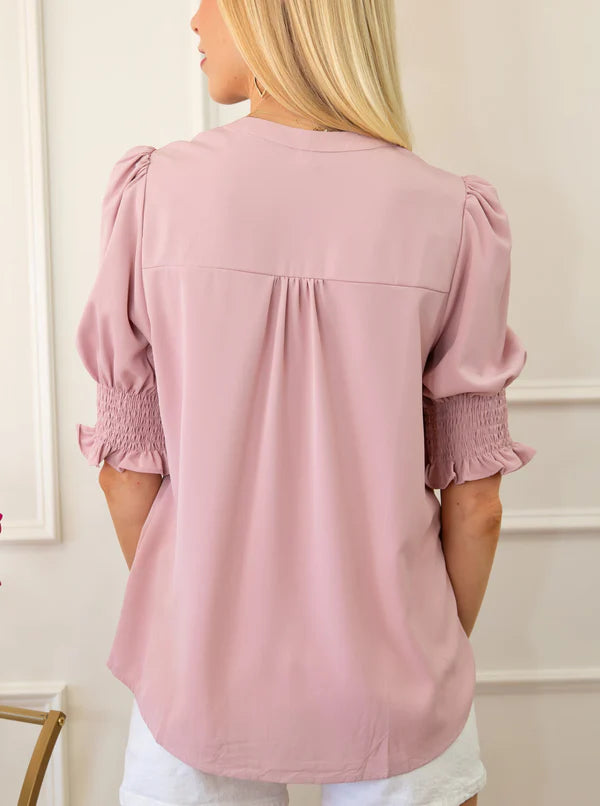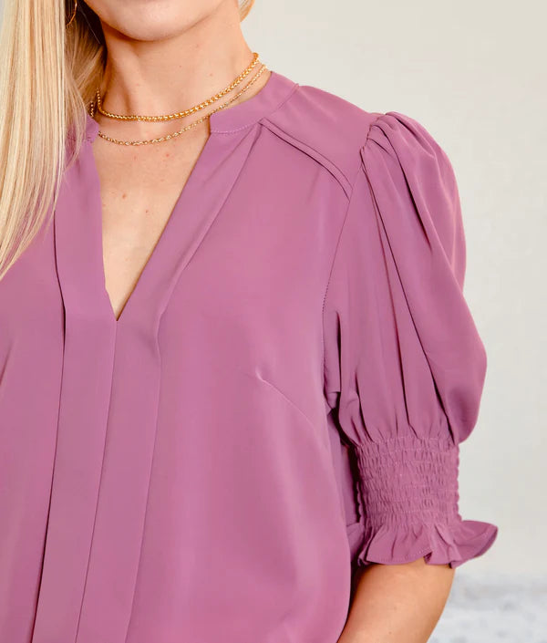 - Smocked puff sleeves with ruffle trim for a flattering finish
